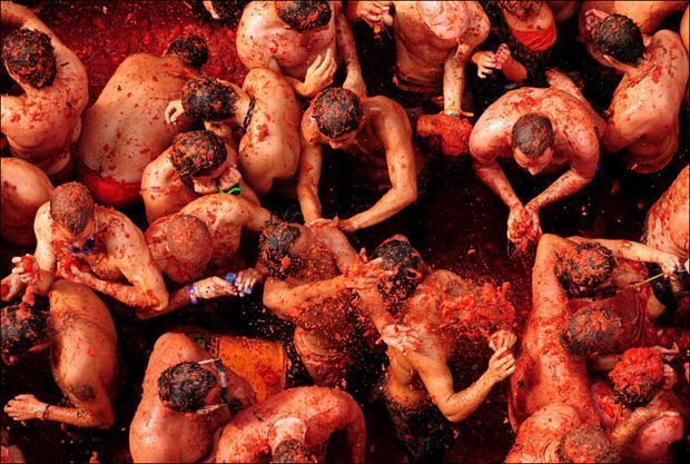 mi sembrava divertente partecipare, ma giuro che non ci tornerei nemmeno se me lo regalassero! non c’è originalità, non c’è l’attesa, non ti accorgi nemmeno dell’inizio che già tutto è finito. un folla di pazzi molesti, ubriachi da giorni (e lo dice una persona che nell’alcol ci lavora!), che approfittano dell’occasione solo per fare del gran casino. la cittadina è una triste e squallida periferia, le strade sono minuscole e sporche, la folla è appiccicosa e la sensazione è quella che se cadi sarai calpestato. e stop. e poi l’odore di pomodoro che non si scorda per giorni, la puzza sul treno del rientro verso valencia, come un carro di bestiame, con le mosche che ronzano intorno… tutti sudici, tutti rossi, gli abiti da buttare. e c’è di bello che c’ho rimesso anche una macchina digitale e non ho tirato nemmeno un pomodoro!
