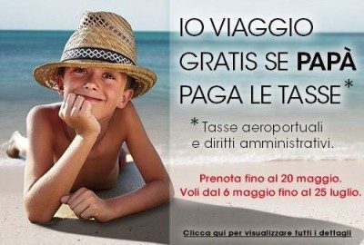 A chi acquista un biglietto entro il prossimo 20 maggio, per volare tra il 6 maggio e il 25 luglio 2013, la compagnia propone quindi un’opportunità che permette un forte risparmio: il bambino che viaggia con uno o più adulti pagherà esclusivamente le tasse aeroportuali e i diritti di emissione.
