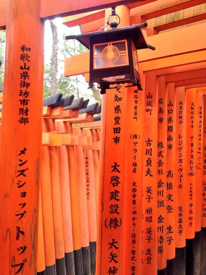 Salendo notate che sono tantissime le volpi che tengono in bocca una chiave. Il tempio è dedicato infatti a Inari che era il dio del grano, quindi della prosperità, e il suo messaggero era la volpe, che qui viene rappresentata appunto con una chiave in bocca. Una curiosità che in pochi sanno, è che mentre salendo i torii sono arancioni senza scritte, scendendo le scale e tornando indietro i torii si presentano piene di scritte giapponesi. Sono i nomi delle aziende e dei privati che hanno fatto delle donazioni al tempio, sperando che l’abbondanza e la prosperità economica arrivi anche a loro.