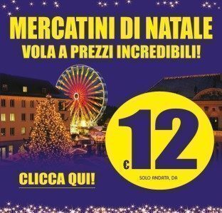 L’offerta che fa Ryanair è per i mercatini di natale a 12€ a tratta. Tra gli aeroporti coinvolti Baden Baden (Germania), Berlino (Germania), Bratislava (Slovacchia), Brema (Germania), Bruxelles (Belgio), Dusseldorf (Germania), Francoforte (Germania), Amburgo (Germania), Parigi (Francia), Maastricht (Olanda).