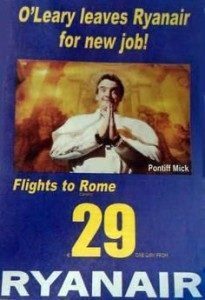 Ecco allora la pubblicità in cui O’Leary annuncia anche lui le dimissioni e promuove voli su Roma a 29 euro. Sempre discusso, ma certo efficace ha lanciato una campagna pubblicitara in cui fa un po’ il verso a papa Benedetto XVI e annuncia di lasciare il suo lavoro con ambizioni papali.