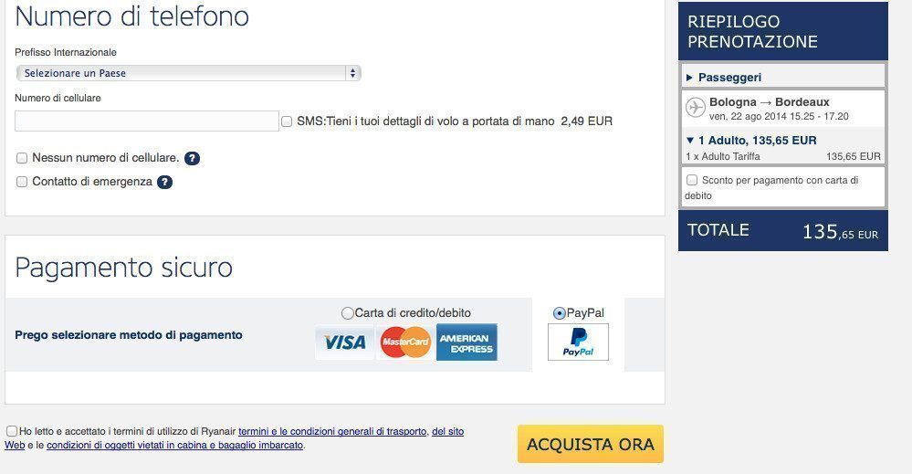 Per dimostrarvi che il pagamento con Paypal è già attivo nel sito Ryanair, ho fatto una simulazione facendo finta di acquistare un volo per la Francia. Ho preso un volo con partenza oggi, solo andata da Bologna. Un volo che non prenderò mai e che non ho pagato eh, mi serve solo per farvi vedere che il pagamento con Paypal, come vedete nella foto, è già impostato e attivo.