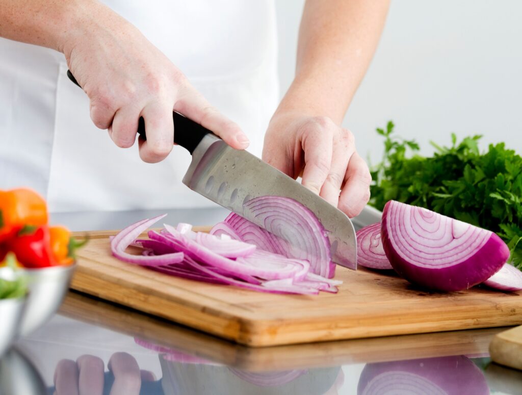 Pulite le cipolle e affettatele sottili, tritate finemente timo e alloro e fate scaldare l’olio in una padella antiaderente.