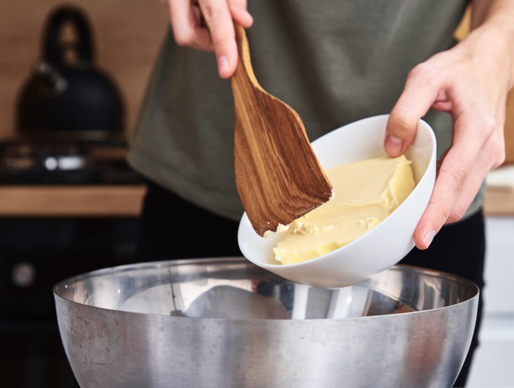 Iniziamo tagliando il burro a pezzetti e montiamolo con lo zucchero, fino ad ottenere una massa chiara e spumosa. È opportuno utilizzare la planetaria oppure le fruste elettriche per ottenere un risultato migliore e più omogeneo ma è tuttavia possibile farlo anche a mano.