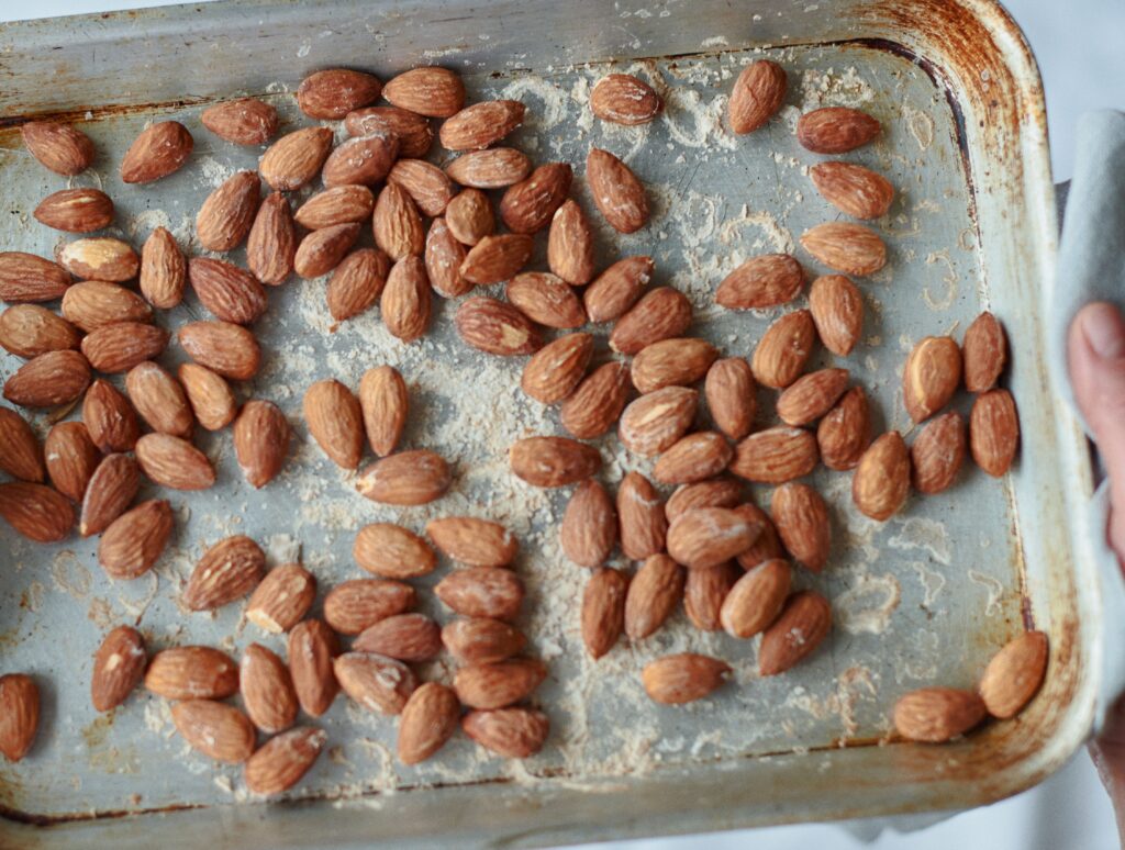 Nel frattempo mettiamo a tostare le mandorle nel forno preriscaldato a 180’ per 5 minuti avendo cura di scuotere la teglia ogni tanto.